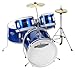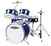 5 Trommeln aus akustisch hochwertigem Holz mit farbiger Spezialfolierung. Das Kinder-Schlagzeug besteht aus Basedrum, Fußmaschine, HiHat, Snaredrum, zwei Tomtoms, einem Standtom, einem Becken und einem paar Drumsticks.
